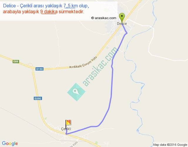 Delice - Çerikli arası yaklaşık olarak 90 km/h ile yukarıda belirtilen sürede olup, iki yerin kuş uçuşu uzaklığı (mesafesi) 6'dir. Yolculuk otobüsle 11 dakika sürmektedir.
