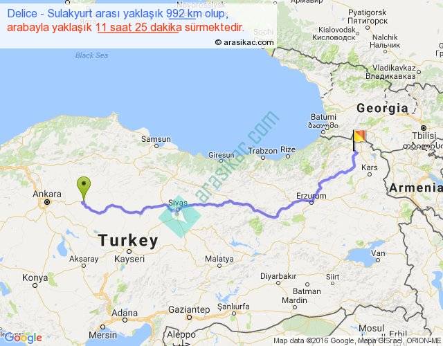 Delice - Sulakyurt arası yaklaşık olarak 90 km/h ile yukarıda belirtilen sürede olup, iki yerin kuş uçuşu uzaklığı (mesafesi) 733'dir. Eğer belirtilen yerler arasında uçak seferi var ise bu süre uçakla 1 saat 07 dakika'ya kadar düşebilir. Yolculuk otobüsle 14 saat 50 dakika sürmektedir.