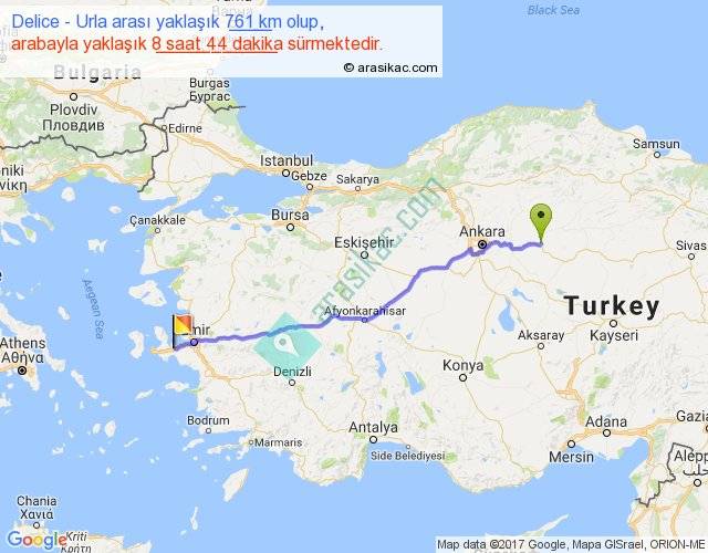 Delice - Urla arası yaklaşık olarak 90 km/h ile yukarıda belirtilen sürede olup, iki yerin kuş uçuşu uzaklığı (mesafesi) 648'dir. Eğer belirtilen yerler arasında uçak seferi var ise bu süre uçakla 59 dakika'ya kadar düşebilir. Yolculuk otobüsle 11 saat 21 dakika sürmektedir.