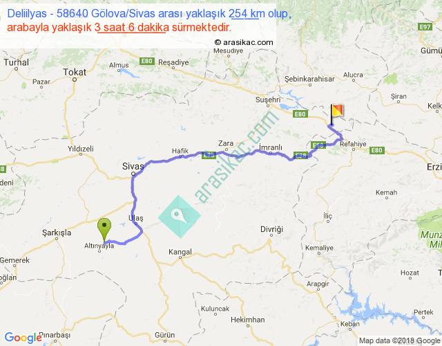 Deliilyas - 58640 Gölova Sivas arası yaklaşık olarak 90 km/h ile yukarıda belirtilen sürede olup, iki yerin kuş uçuşu uzaklığı (mesafesi) 173'dir. Yolculuk otobüsle 4 saat 1 dakika sürmektedir.