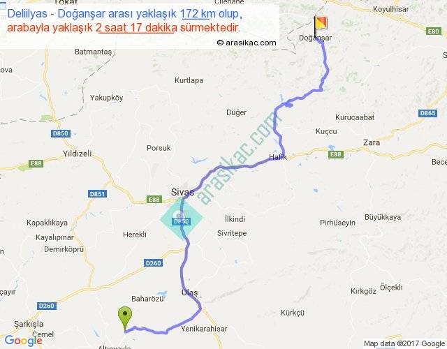 Deliilyas - Doğanşar arası yaklaşık olarak 90 km/h ile yukarıda belirtilen sürede olup, iki yerin kuş uçuşu uzaklığı (mesafesi) 117'dir. Yolculuk otobüsle 2 saat 58 dakika sürmektedir.