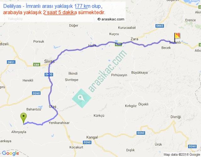 Deliilyas - İmranlı arası yaklaşık olarak 90 km/h ile yukarıda belirtilen sürede olup, iki yerin kuş uçuşu uzaklığı (mesafesi) 128'dir. Yolculuk otobüsle 2 saat 42 dakika sürmektedir.