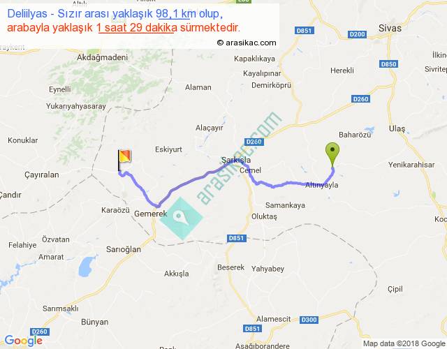 Deliilyas - Sızır arası yaklaşık olarak 90 km/h ile yukarıda belirtilen sürede olup, iki yerin kuş uçuşu uzaklığı (mesafesi) 72'dir. Yolculuk otobüsle 1 saat 55 dakika sürmektedir.