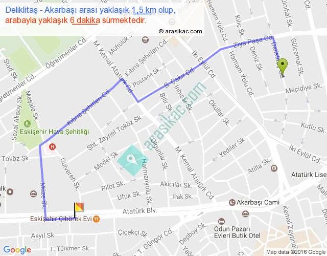 Deliklitaş - Akarbaşı arası yaklaşık olarak 90 km/h ile yukarıda belirtilen sürede olup, iki yerin kuş uçuşu uzaklığı (mesafesi) 1'dir. Yolculuk otobüsle 7 dakika sürmektedir.