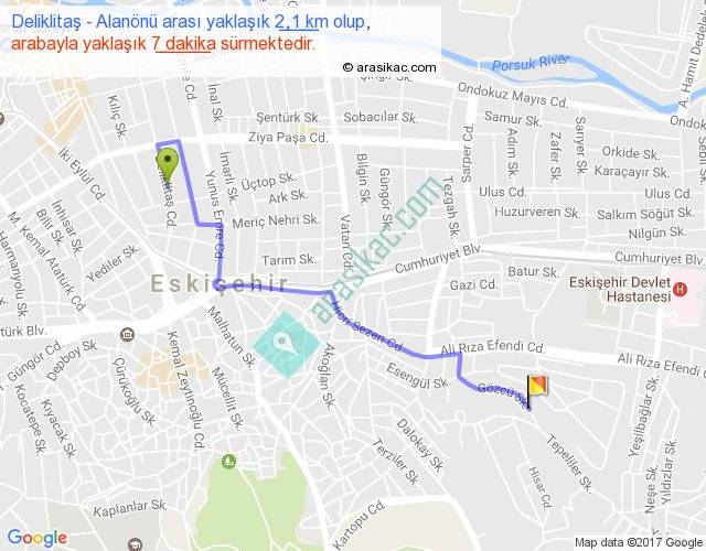 Deliklitaş - Alanönü arası yaklaşık olarak 90 km/h ile yukarıda belirtilen sürede olup, iki yerin kuş uçuşu uzaklığı (mesafesi) 1'dir. Yolculuk otobüsle 9 dakika sürmektedir.