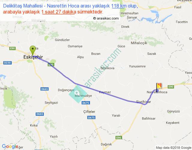 Deliklitaş Mahallesi - Nasrettin Hoca arası yaklaşık olarak 90 km/h ile yukarıda belirtilen sürede olup, iki yerin kuş uçuşu uzaklığı (mesafesi) 101'dir. Yolculuk otobüsle 1 saat 53 dakika sürmektedir.