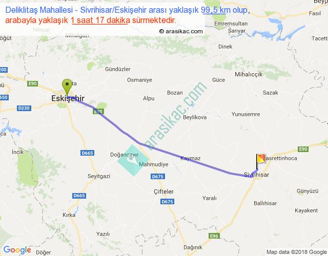 Deliklitaş Mahallesi - Sivrihisar Eskişehir arası yaklaşık olarak 90 km/h ile yukarıda belirtilen sürede olup, iki yerin kuş uçuşu uzaklığı (mesafesi) 93'dir. Yolculuk otobüsle 1 saat 40 dakika sürmektedir.
