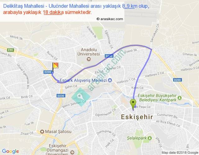 Deliklitaş Mahallesi - Uluönder Mahallesi arası yaklaşık olarak 90 km/h ile yukarıda belirtilen sürede olup, iki yerin kuş uçuşu uzaklığı (mesafesi) 4'dir. Yolculuk otobüsle 23 dakika sürmektedir.