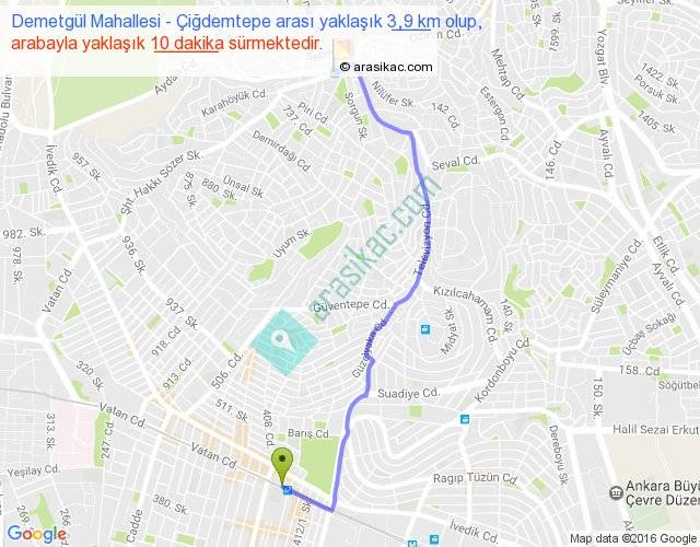 Demetgül Mahallesi - Çiğdemtepe arası yaklaşık olarak 90 km/h ile yukarıda belirtilen sürede olup, iki yerin kuş uçuşu uzaklığı (mesafesi) 3'dir. Yolculuk otobüsle 13 dakika sürmektedir.