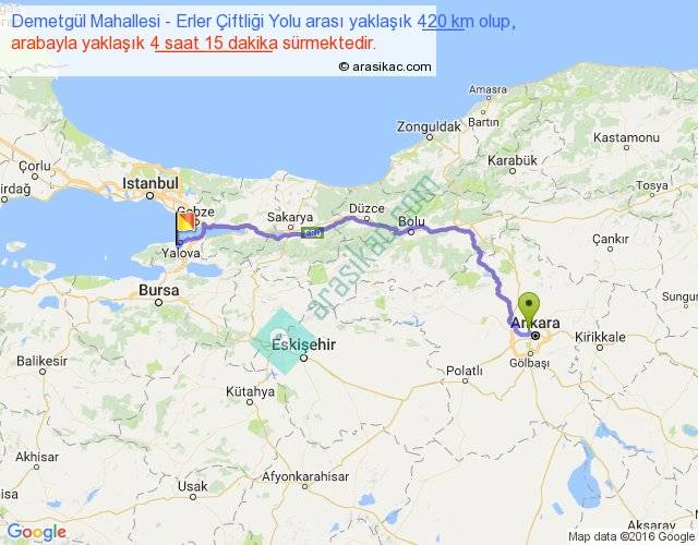 Demetgül Mahallesi - Erler Çiftliği Yolu arası yaklaşık olarak 90 km/h ile yukarıda belirtilen sürede olup, iki yerin kuş uçuşu uzaklığı (mesafesi) 308'dir. Eğer belirtilen yerler arasında uçak seferi var ise bu süre uçakla 28 dakika'ya kadar düşebilir. Yolculuk otobüsle 5 saat 31 dakika sürmektedir.
