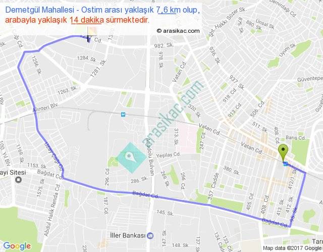 Eğer Demetgül Mahallesi Ostim arası ne kadar yakar (benzin/mazot) diyorsanız, kilometrede 3 ₺ yakan bir aracınız var ise 21, km'de 4 ₺ yakan bir aracınız var ise 28, km'de 5 ₺ yakan bir aracınız var ise 35 ile bu yolculuğu tamamlayabilirsiniz.