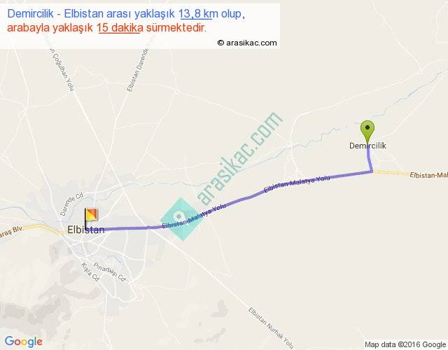 Demircilik - Elbistan arası yaklaşık olarak 90 km/h ile yukarıda belirtilen sürede olup, iki yerin kuş uçuşu uzaklığı (mesafesi) 13'dir. Yolculuk otobüsle 19 dakika sürmektedir.