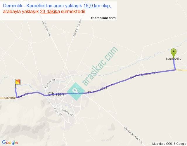 Demircilik - Karaelbistan arası yaklaşık olarak 90 km/h ile yukarıda belirtilen sürede olup, iki yerin kuş uçuşu uzaklığı (mesafesi) 16'dir. Yolculuk otobüsle 29 dakika sürmektedir.