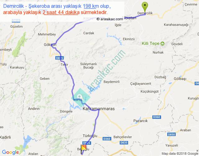 Demircilik - Şekeroba arası yaklaşık olarak 90 km/h ile yukarıda belirtilen sürede olup, iki yerin kuş uçuşu uzaklığı (mesafesi) 119'dir. Yolculuk otobüsle 3 saat 33 dakika sürmektedir.