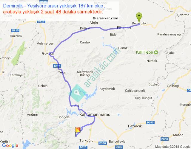 Demircilik - Yeşilyöre arası yaklaşık olarak 90 km/h ile yukarıda belirtilen sürede olup, iki yerin kuş uçuşu uzaklığı (mesafesi) 104'dir. Yolculuk otobüsle 3 saat 38 dakika sürmektedir.