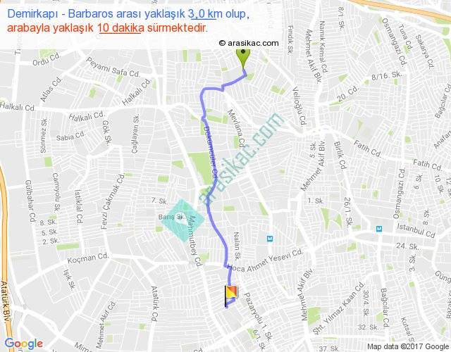 Demirkapı - Barbaros arası yaklaşık olarak 90 km/h ile yukarıda belirtilen sürede olup, iki yerin kuş uçuşu uzaklığı (mesafesi) 2'dir. Yolculuk otobüsle 13 dakika sürmektedir.
