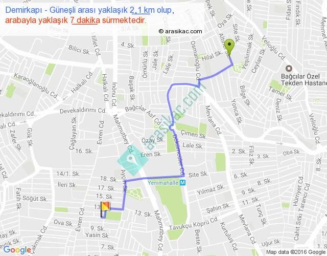 Demirkapı - Güneşli arası yaklaşık olarak 90 km/h ile yukarıda belirtilen sürede olup, iki yerin kuş uçuşu uzaklığı (mesafesi) 1'dir. Yolculuk otobüsle 9 dakika sürmektedir.