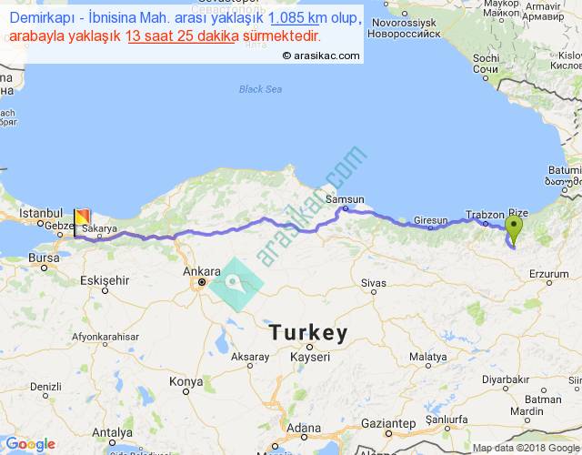 Demirkapı - İbnisina Mah. arası yaklaşık olarak 90 km/h ile yukarıda belirtilen sürede olup, iki yerin kuş uçuşu uzaklığı (mesafesi) 888'dir. Eğer belirtilen yerler arasında uçak seferi var ise bu süre uçakla 1 saat 21 dakika'ya kadar düşebilir. Yolculuk otobüsle 17 saat 26 dakika sürmektedir.