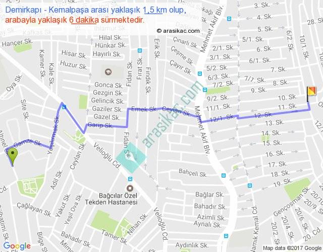 Demirkapı - Kemalpaşa arası yaklaşık olarak 90 km/h ile yukarıda belirtilen sürede olup, iki yerin kuş uçuşu uzaklığı (mesafesi) 1'dir. Yolculuk otobüsle 7 dakika sürmektedir.