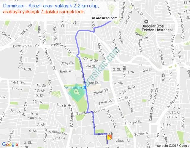 Demirkapı - Kirazlı arası yaklaşık olarak 90 km/h ile yukarıda belirtilen sürede olup, iki yerin kuş uçuşu uzaklığı (mesafesi) 2'dir. Yolculuk otobüsle 9 dakika sürmektedir.