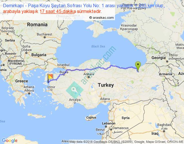 Demirkapı - Paşa Koyu Şeytan Sofrası Yolu No: 1 arası yaklaşık olarak 90 km/h ile yukarıda belirtilen sürede olup, iki yerin kuş uçuşu uzaklığı (mesafesi) 1172'dir. Eğer belirtilen yerler arasında uçak seferi var ise bu süre uçakla 1 saat 48 dakika'ya kadar düşebilir. Yolculuk otobüsle 23 saat 4 dakika sürmektedir.