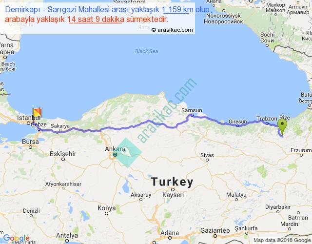 Demirkapı - Sarıgazi Mahallesi arası yaklaşık olarak 90 km/h ile yukarıda belirtilen sürede olup, iki yerin kuş uçuşu uzaklığı (mesafesi) 938'dir. Eğer belirtilen yerler arasında uçak seferi var ise bu süre uçakla 1 saat 26 dakika'ya kadar düşebilir. Yolculuk otobüsle 18 saat 23 dakika sürmektedir.