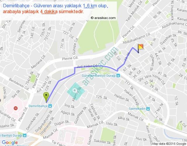 Demirlibahçe - Gülveren arası yaklaşık olarak 90 km/h ile yukarıda belirtilen sürede olup, iki yerin kuş uçuşu uzaklığı (mesafesi) 1'dir. Yolculuk otobüsle 5 dakika sürmektedir.