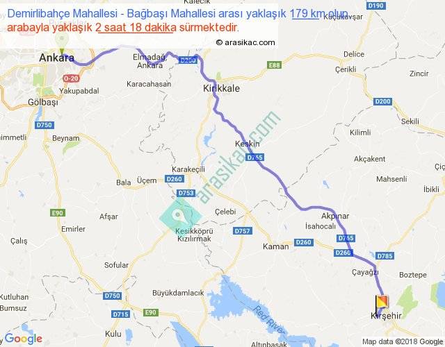 Demirlibahçe Mahallesi - Bağbaşı Mahallesi arası yaklaşık olarak 90 km/h ile yukarıda belirtilen sürede olup, iki yerin kuş uçuşu uzaklığı (mesafesi) 138'dir. Yolculuk otobüsle 2 saat 59 dakika sürmektedir.
