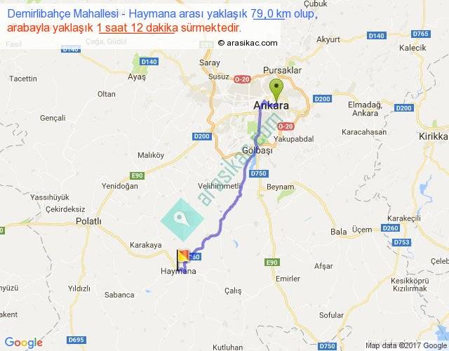 Demirlibahçe Mahallesi - Haymana arası yaklaşık olarak 90 km/h ile yukarıda belirtilen sürede olup, iki yerin kuş uçuşu uzaklığı (mesafesi) 65'dir. Yolculuk otobüsle 1 saat 33 dakika sürmektedir.