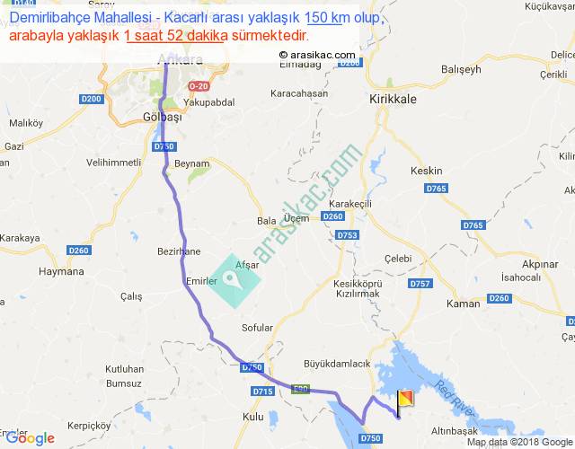 Demirlibahçe Mahallesi - Kacarlı arası yaklaşık olarak 90 km/h ile yukarıda belirtilen sürede olup, iki yerin kuş uçuşu uzaklığı (mesafesi) 109'dir. Yolculuk otobüsle 2 saat 25 dakika sürmektedir.