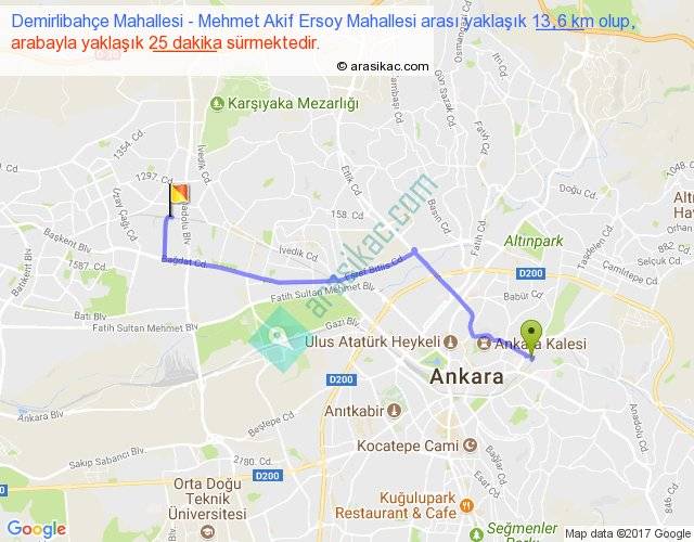 Demirlibahçe Mahallesi - Mehmet Akif Ersoy Mahallesi arası yaklaşık olarak 90 km/h ile yukarıda belirtilen sürede olup, iki yerin kuş uçuşu uzaklığı (mesafesi) 10'dir. Yolculuk otobüsle 32 dakika sürmektedir.