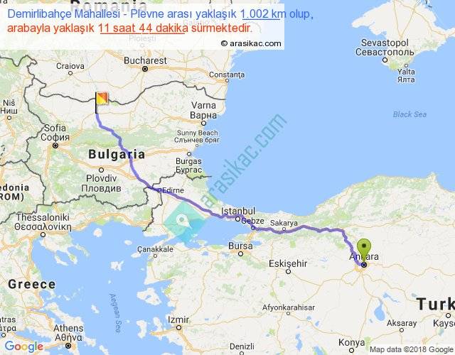 Demirlibahçe Mahallesi - Plevne arası yaklaşık olarak 90 km/h ile yukarıda belirtilen sürede olup, iki yerin kuş uçuşu uzaklığı (mesafesi) 783'dir. Eğer belirtilen yerler arasında uçak seferi var ise bu süre uçakla 1 saat 12 dakika'ya kadar düşebilir. Yolculuk otobüsle 15 saat 15 dakika sürmektedir.