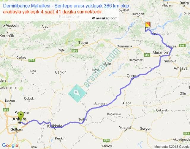 Demirlibahçe Mahallesi - Şentepe arası yaklaşık olarak 90 km/h ile yukarıda belirtilen sürede olup, iki yerin kuş uçuşu uzaklığı (mesafesi) 240'dir. Yolculuk otobüsle 6 saat 5 dakika sürmektedir.