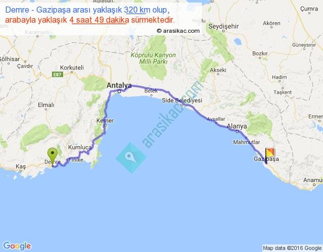 Demre - Gazipaşa arası yaklaşık olarak 90 km/h ile yukarıda belirtilen sürede olup, iki yerin kuş uçuşu uzaklığı (mesafesi) 207'dir. Yolculuk otobüsle 6 saat 17 dakika sürmektedir.