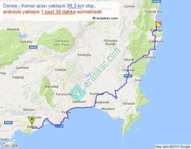 Demre - Kemer arası yaklaşık olarak 90 km/h ile yukarıda belirtilen sürede olup, iki yerin kuş uçuşu uzaklığı (mesafesi) 64'dir. Yolculuk otobüsle 2 saat 7 dakika sürmektedir.