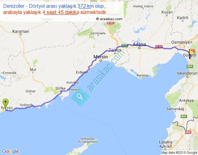 Denizciler - Dörtyol arası yaklaşık olarak 90 km/h ile yukarıda belirtilen sürede olup, iki yerin kuş uçuşu uzaklığı (mesafesi) 301'dir. Eğer belirtilen yerler arasında uçak seferi var ise bu süre uçakla 27 dakika'ya kadar düşebilir. Yolculuk otobüsle 6 saat 10 dakika sürmektedir.