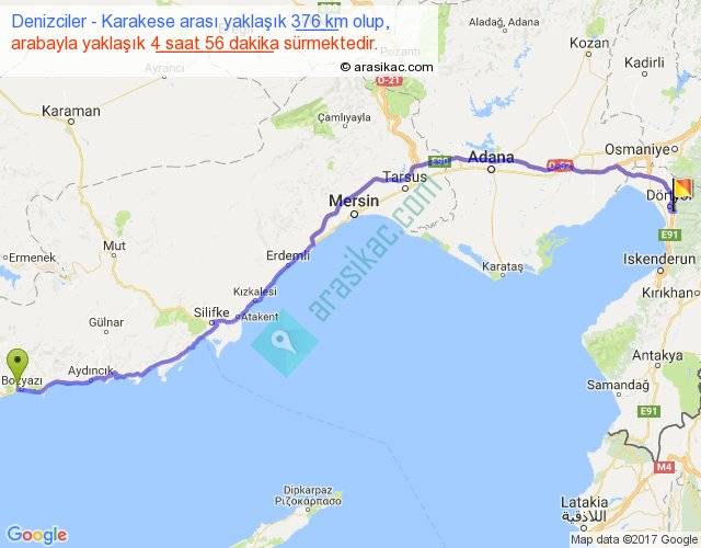 Denizciler - Karakese arası yaklaşık olarak 90 km/h ile yukarıda belirtilen sürede olup, iki yerin kuş uçuşu uzaklığı (mesafesi) 303'dir. Eğer belirtilen yerler arasında uçak seferi var ise bu süre uçakla 27 dakika'ya kadar düşebilir. Yolculuk otobüsle 6 saat 24 dakika sürmektedir.