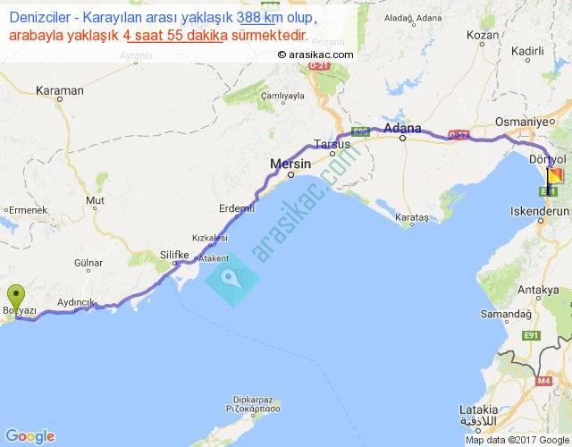 Denizciler - Karayılan arası yaklaşık olarak 90 km/h ile yukarıda belirtilen sürede olup, iki yerin kuş uçuşu uzaklığı (mesafesi) 299'dir. Eğer belirtilen yerler arasında uçak seferi var ise bu süre uçakla 27 dakika'ya kadar düşebilir. Yolculuk otobüsle 6 saat 23 dakika sürmektedir.
