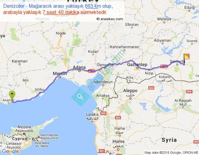 Denizciler - Mağaracık arası yaklaşık olarak 90 km/h ile yukarıda belirtilen sürede olup, iki yerin kuş uçuşu uzaklığı (mesafesi) 553'dir. Eğer belirtilen yerler arasında uçak seferi var ise bu süre uçakla 51 dakika'ya kadar düşebilir. Yolculuk otobüsle 9 saat 58 dakika sürmektedir.