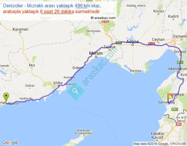 Denizciler - Mızraklı arası yaklaşık olarak 90 km/h ile yukarıda belirtilen sürede olup, iki yerin kuş uçuşu uzaklığı (mesafesi) 272'dir. Eğer belirtilen yerler arasında uçak seferi var ise bu süre uçakla 25 dakika'ya kadar düşebilir. Yolculuk otobüsle 8 saat 21 dakika sürmektedir.