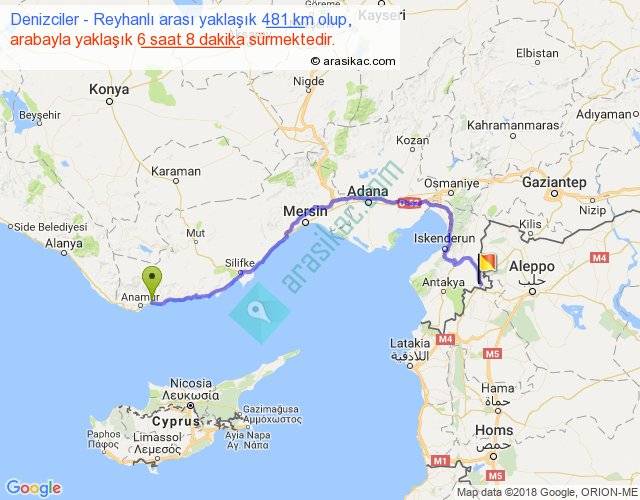 Denizciler - Reyhanlı arası yaklaşık olarak 90 km/h ile yukarıda belirtilen sürede olup, iki yerin kuş uçuşu uzaklığı (mesafesi) 323'dir. Eğer belirtilen yerler arasında uçak seferi var ise bu süre uçakla 29 dakika'ya kadar düşebilir. Yolculuk otobüsle 7 saat 58 dakika sürmektedir.