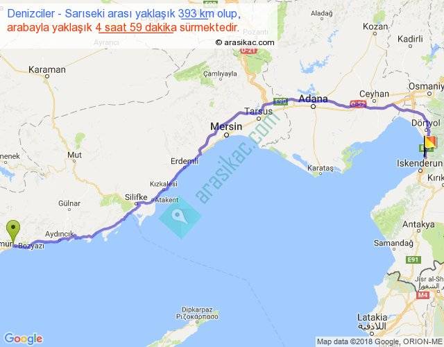Denizciler - Sarıseki arası yaklaşık olarak 90 km/h ile yukarıda belirtilen sürede olup, iki yerin kuş uçuşu uzaklığı (mesafesi) 297'dir. Eğer belirtilen yerler arasında uçak seferi var ise bu süre uçakla 27 dakika'ya kadar düşebilir. Yolculuk otobüsle 6 saat 28 dakika sürmektedir.