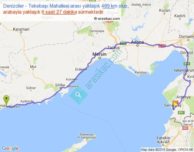 Denizciler - Tekebaşı Mahallesi arası yaklaşık olarak 90 km/h ile yukarıda belirtilen sürede olup, iki yerin kuş uçuşu uzaklığı (mesafesi) 271'dir. Eğer belirtilen yerler arasında uçak seferi var ise bu süre uçakla 25 dakika'ya kadar düşebilir. Yolculuk otobüsle 8 saat 23 dakika sürmektedir.