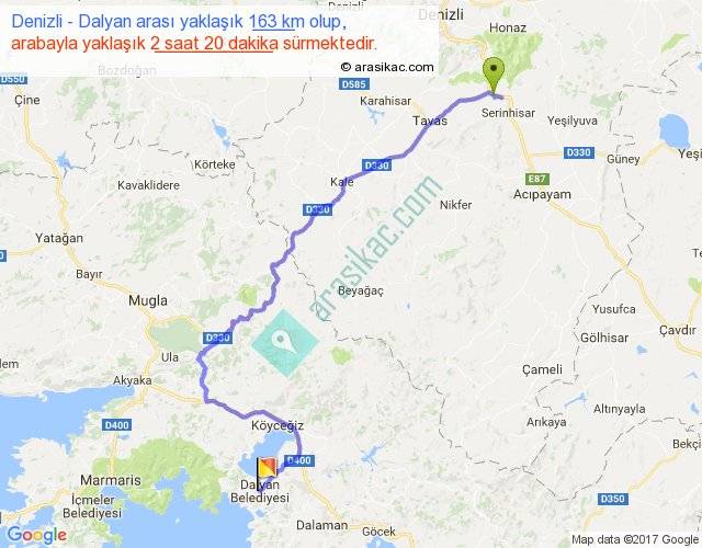 Denizli - Dalyan arası yaklaşık olarak 90 km/h ile yukarıda belirtilen sürede olup, iki yerin kuş uçuşu uzaklığı (mesafesi) 101'dir. Yolculuk otobüsle 3 saat 2 dakika sürmektedir.