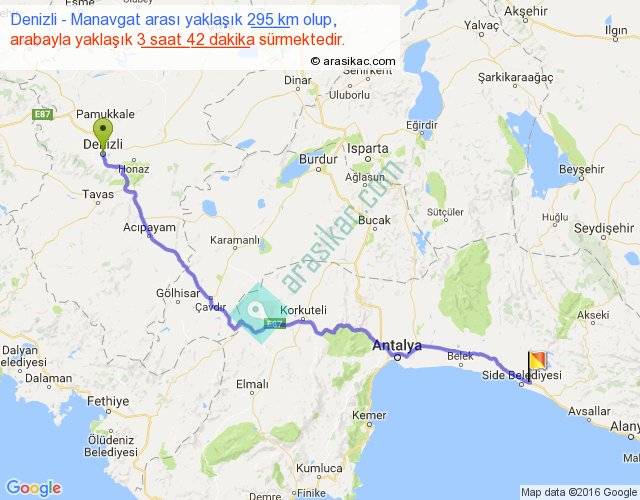 Denizli - Manavgat arası yaklaşık olarak 90 km/h ile yukarıda belirtilen sürede olup, iki yerin kuş uçuşu uzaklığı (mesafesi) 234'dir. Yolculuk otobüsle 4 saat 48 dakika sürmektedir.
