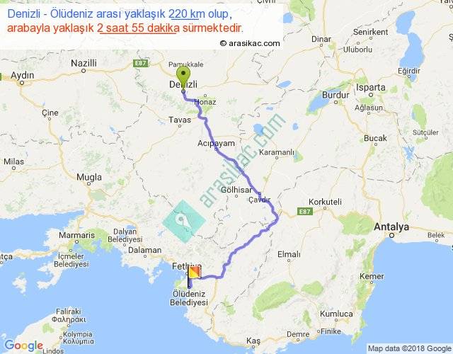 Denizli - Ölüdeniz arası yaklaşık olarak 90 km/h ile yukarıda belirtilen sürede olup, iki yerin kuş uçuşu uzaklığı (mesafesi) 134'dir. Yolculuk otobüsle 3 saat 47 dakika sürmektedir.