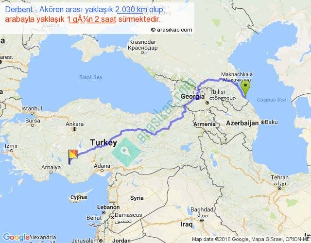 Derbent - Akören arası yaklaşık olarak 90 km/h ile yukarıda belirtilen sürede olup, iki yerin kuş uçuşu uzaklığı (mesafesi) 1443'dir. Eğer belirtilen yerler arasında uçak seferi var ise bu süre uçakla 2 saat 13 dakika'ya kadar düşebilir. Yolculuk otobüsle 1 gün 9 saat sürmektedir.