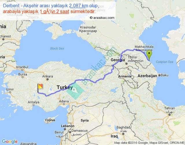 Derbent - Akşehir arası yaklaşık olarak 90 km/h ile yukarıda belirtilen sürede olup, iki yerin kuş uçuşu uzaklığı (mesafesi) 1479'dir. Eğer belirtilen yerler arasında uçak seferi var ise bu süre uçakla 2 saat 16 dakika'ya kadar düşebilir. Yolculuk otobüsle 1 gün 9 saat sürmektedir.