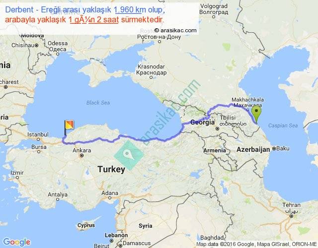 Derbent - Ereğli arası yaklaşık olarak 90 km/h ile yukarıda belirtilen sürede olup, iki yerin kuş uçuşu uzaklığı (mesafesi) 1393'dir. Eğer belirtilen yerler arasında uçak seferi var ise bu süre uçakla 2 saat 08 dakika'ya kadar düşebilir. Yolculuk otobüsle 1 gün 9 saat sürmektedir.