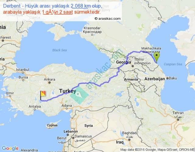Derbent - Hüyük arası yaklaşık olarak 90 km/h ile yukarıda belirtilen sürede olup, iki yerin kuş uçuşu uzaklığı (mesafesi) 1482'dir. Eğer belirtilen yerler arasında uçak seferi var ise bu süre uçakla 2 saat 16 dakika'ya kadar düşebilir. Yolculuk otobüsle 1 gün 9 saat sürmektedir.